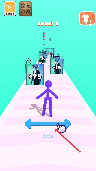 开始挑战关卡,通过左右滑动屏幕来操控角色移动。移动时优先撞击带有“+”数值的门,尤其是数值较高的(比如+75),这样能快速让角色的体型得到强化。