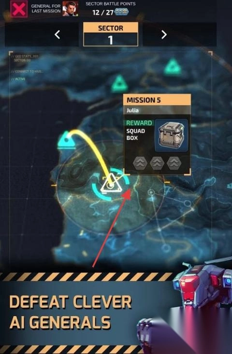 2、进入战区,选择“MISSION5”等任务,击败AI将军,获取“SQUADBOX”等奖励,拓展游戏进度。