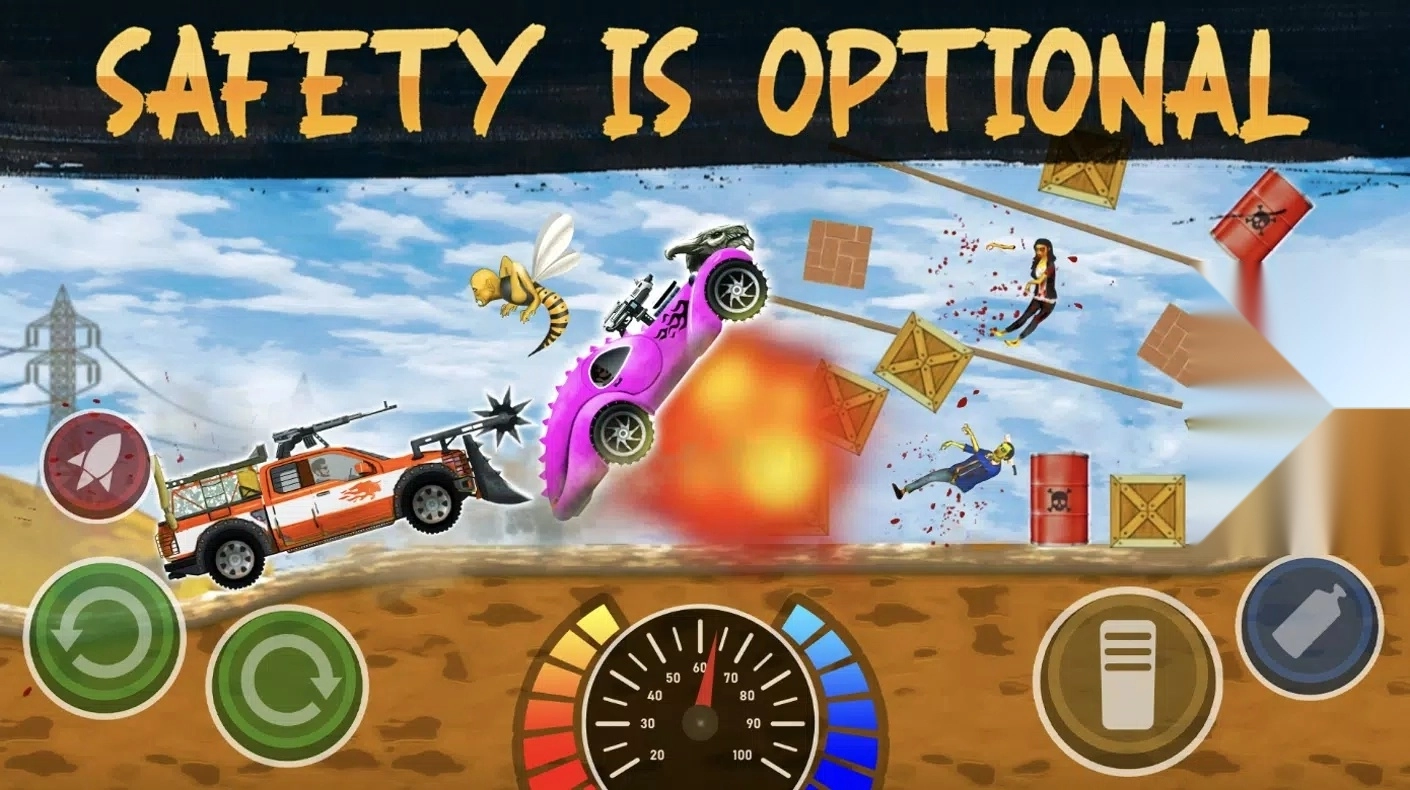 这是一款设定在僵尸末日背景下的2D赛车模拟游戏,你需要驾驶自己的汽车,撞向那些迎面扑来的僵尸怪物。