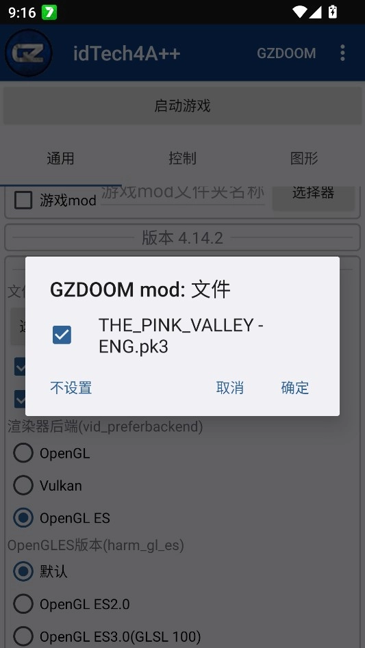 5、在下方点击“选择mod文件”,选中“THE_PINKVALLEY-ENG.pk3”文件后进行确认。