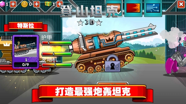 在《登山坦克3D》这款游戏里,你能够自由对坦克进行改装,还可以挑选不同的部件和武器来配备。