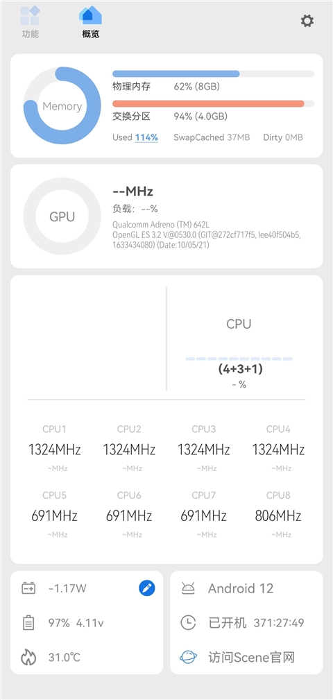 2、实时监控CPU、内存、电池温度、功耗、FPS等核心指标,数据全面且更新及时。