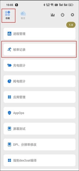 7、通过多任务窗口回到软件界面,接着进入“功能→帧率记录”选项,就能查看包含最大帧率、最小帧率、平均帧率等在内的详细监控数据。