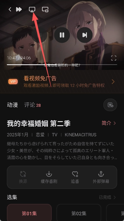 支持一键投屏功能,只需将手机与电视连接至同一Wi-Fi网络,在播放页面点击投屏按钮,即可通过大屏追番,获得更优质的观看体验。