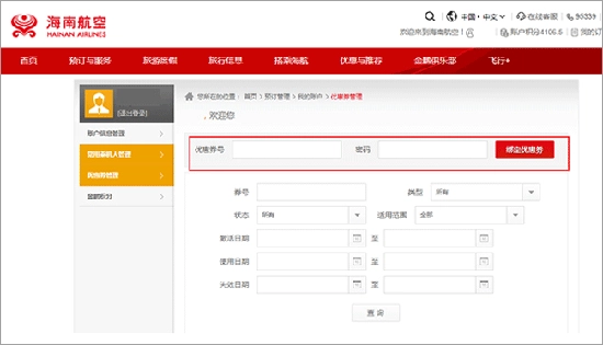进入海南航空首页后,找到导航栏里的“预订与服务”并点击,接着在弹出的下拉列表中,选择“会员中心”板块下的“优惠券管理”选项,具体操作可参考下图: