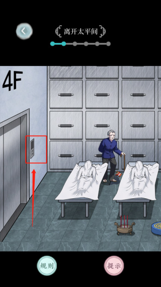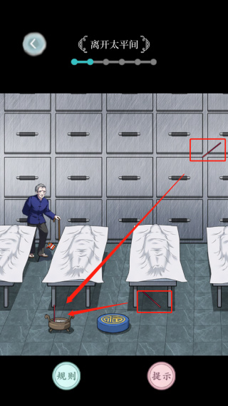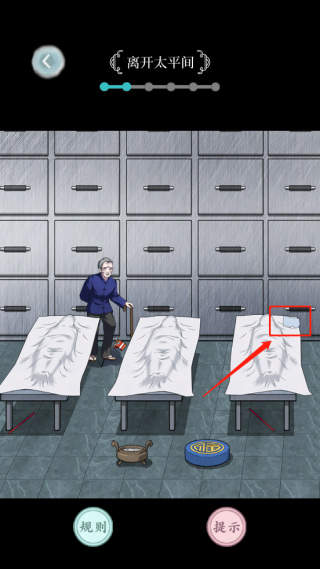 4、这时玩家可能就会来到太平间,在这里玩家可以点击图中绿色箭头所指的纸条