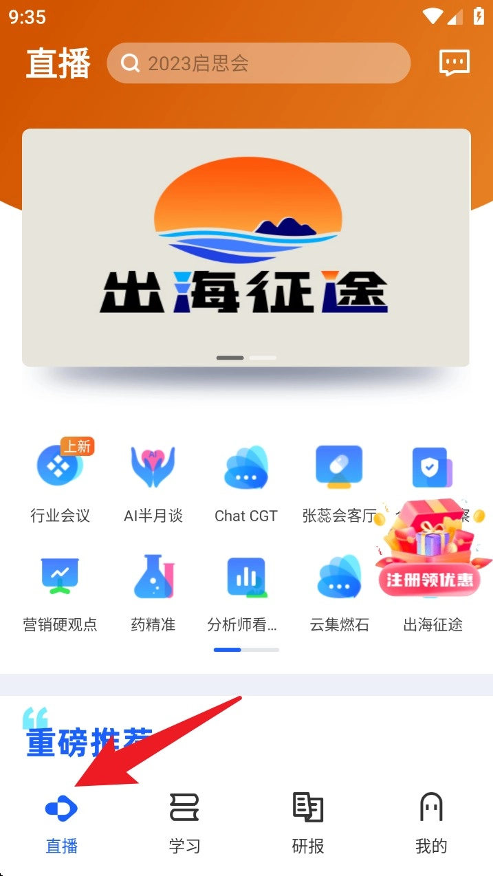 在首页底部点击直播图标,就能进入直播模块,浏览热门会议、专题活动以及实时视频内容。