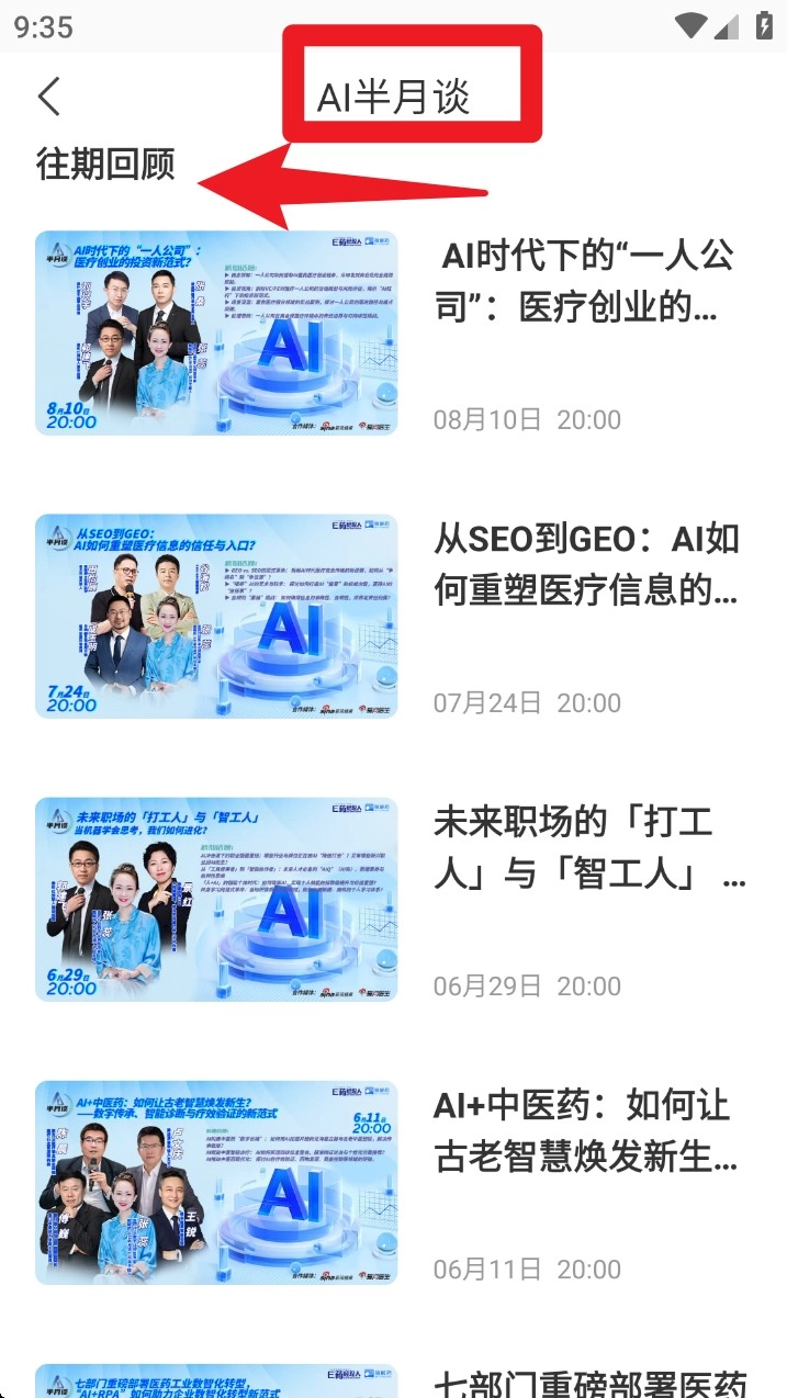 点击直播首页的半月谈入口,即可跳转至往期回顾页面,在此可依据时间浏览历史直播内容。