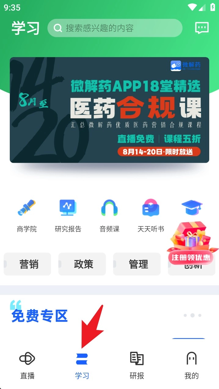 在底部导航栏点击“学习”选项,即可进入学习专区,在这里能够访问商学院、研究报告、音频课等各类学习资源。