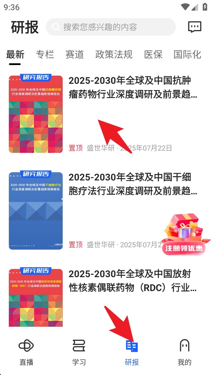 点击下方的研报图标后,系统将呈现各类专业的行业研报内容,你可以通过标签分类进行浏览,并且能够查看研报的全文详情。