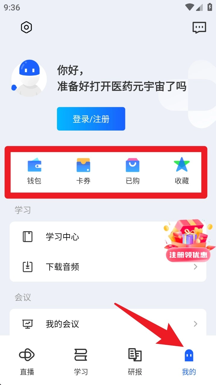 点击底部的“我的”按钮进入个人中心后,你可以查看钱包、卡券、已购内容和收藏记录,还能在此进行登录注册操作。