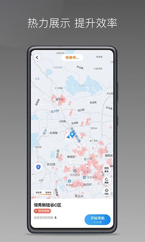 1、接单界面简洁,订单信息全屏展示,开车时一眼看清目的地和预估收入。