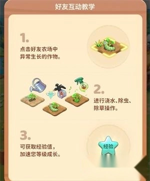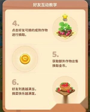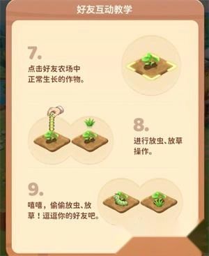 正向协助是点击好友农场中异常生长的作物进行浇水、除虫、除草操作以获取经验值加速等级成长,资源获取是点击好友可摘的成熟作物进行摘取并出售换取金币且好友列表越满摘菜快乐越满,整蛊互动是点击好友农场中正常生长的作物进行放虫、放草操作逗弄好友。