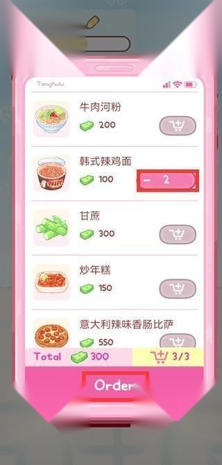 2、在点餐界面选中食物加入购物车,添加完所有物品后点击“Order”;