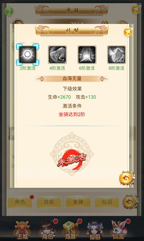 5、玩家除了能够进行升级操作,还能够为坐骑激活皮肤,激活皮肤后,玩家还可获取大额的属性加成。