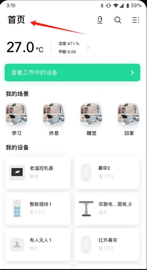 打开软件后,点击首页即可查看家中的温度、湿度等环境数据。