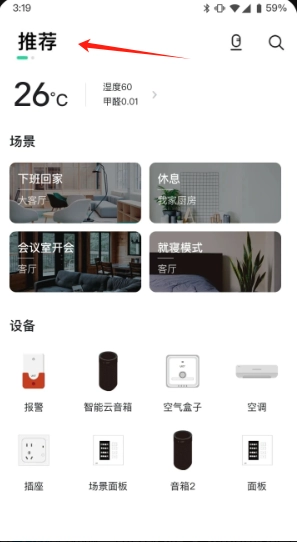 点击推荐的场景选项,例如“下班回家”模式,就能快速切换家居环境状态。