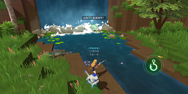 3、这时右手边会出现鱼钩图标,而头顶会出现浮标,此时属于等待状态,当头顶图标变为绿色鱼图标,鱼钩也变为绿色时,可以点击鱼钩进行钓鱼(鱼上钩时需要尽快点击鱼钩,否则鱼会脱钩)。
