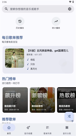 界面简洁清新,支持歌词同步显示,还能一键收藏、调整音效,听歌操作流畅顺滑,体验感拉满。
