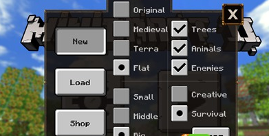 2、玩家可以自由选择,另外打钩的位置是三种选项可以选择是否有树、动物和敌人,还可以选择地图大小并且游戏模式,包括创意模式和生存模式,