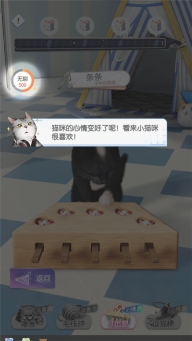 8、初入新家,猫咪心情值较低,我们点击游戏,让它放松一下;