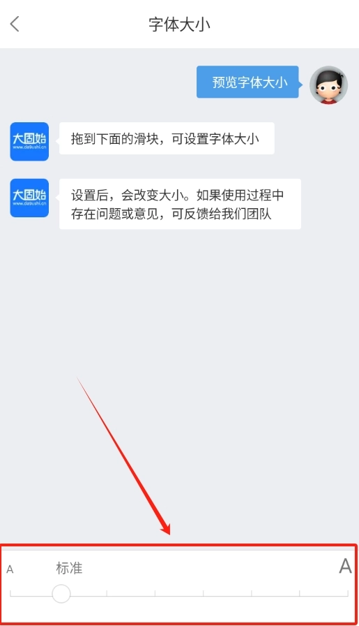 点击“字体大小”选项后,底部会出现白色小圆块,用手指左右滑动这些小圆块,就能随意调整字体大小了。