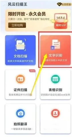 首先在手机上下载并安装风云扫描王,打开应用后,在主页找到并点击【文字识别】功能,即可开始使用该功能。