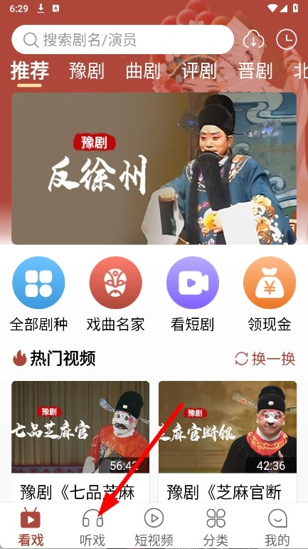 打开戏曲大全,点击底部听戏,进入听戏页面。