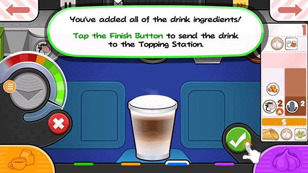 18、你已经添加了所有的饮料成分!点击完成按钮发送饮料到浇头站。
