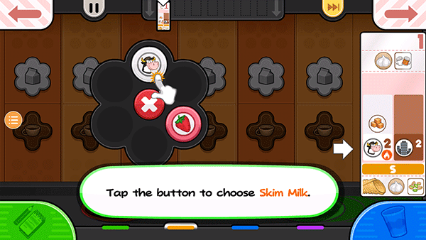6、Janana要两杯脱脂牛奶。点击并按住倒奶按钮,直到玻璃杯装满2杯牛奶