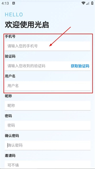 在注册页面,先填写手机号,获取并填写对应的验证码后,再填写用户名。