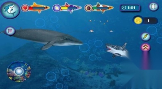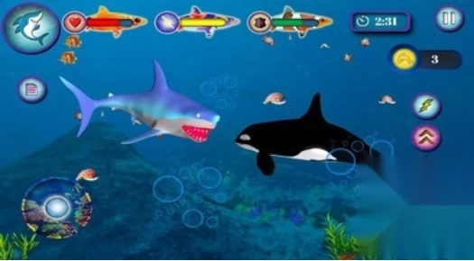 请留意鲨鱼的体力状况。一旦其力量值降到红线以下,你就得马上让它进食,赶紧为鲨鱼寻觅食物。