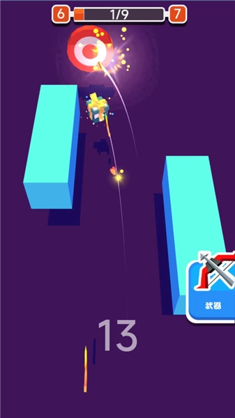 射击新手训练营是一款休闲类射击游戏,每一关都有清晰的通关要求,像“命中目标物8次”。投掷轨迹中会出现各类方块组成的阻碍,游戏难度会随着游玩进程不断增加,障碍物从最初固定的一两个慢慢变成包含多重要素和移动方块的综合挑战。通过关卡能获取金币,用来解锁带有不同特效的武器,让你的战术选择更加多样。