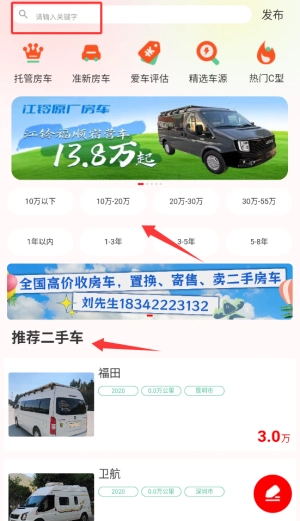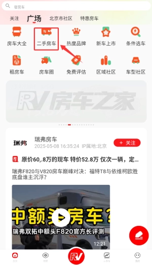 登录房车之家后,在首页导航栏选择“二手房车”频道,即可进入二手车源展示页面。