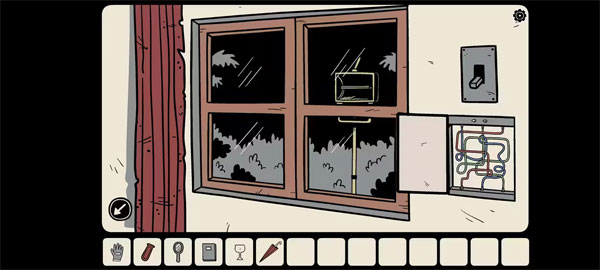在电视机旁大柜子的底部,有一扇门能用钥匙打开,打开后能拿到玻璃碗。走到房门前,装上开关面板,如此一来就能控制屋中电源的开启与关闭。此刻先关闭电源,接着戴上绝缘手套,去处理窗户边的电线,将它们连接妥当后,按下电线上方的开关,屋外的强光灯便会亮起。随后你拉上窗帘,发现窗帘上有几个破洞,强光透过这些破洞,照射在对面的墙上,映出特定的几个符号。你正看向那面墙,突然一个黑影一闪而过,吓了你一跳。而墙上映出的符号,结合书中给出的提示,就是窗下密码锁的答案。就在你准备解锁时,感觉有一只手缓缓搭在了自己的肩膀上,你心头一惊,赶忙转头查看,却发现身后空无一物。打开抽屉,里面放着一根撬棍。