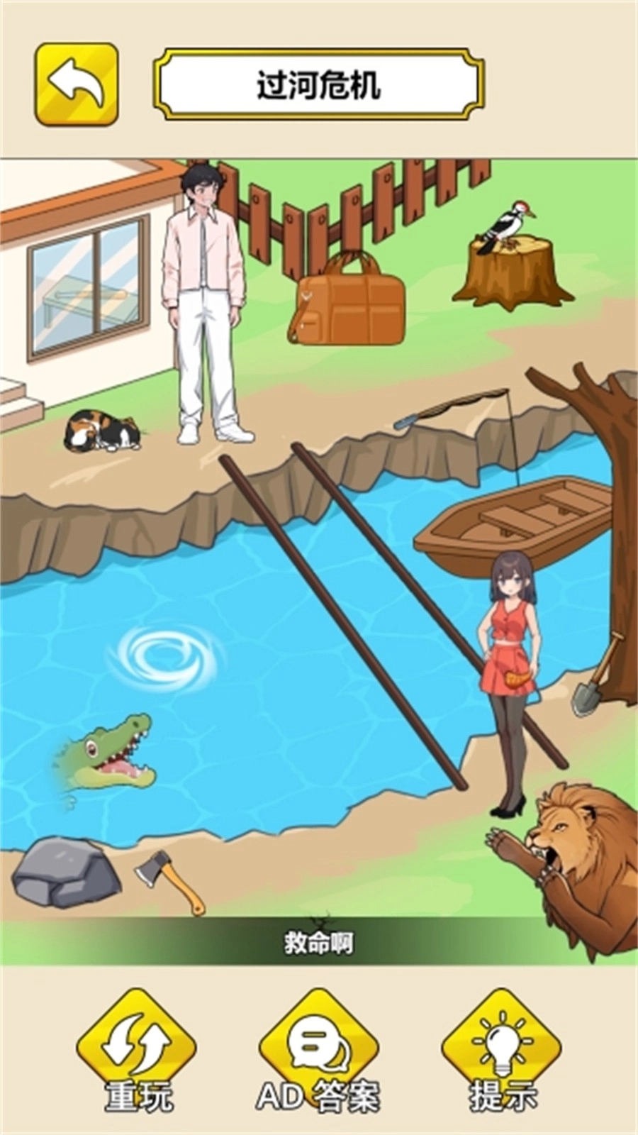 在过河这一危机关卡中,得合理运用场景里的物品去完成挑战。