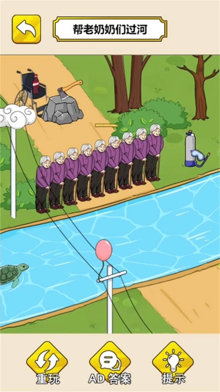 找到树上那个黄色的气球,把它拖给奶奶;或者把水里的乌龟拖到奶奶脚边,这样就能依靠气球的浮力或者乌龟的浮力,帮助奶奶渡过河去。