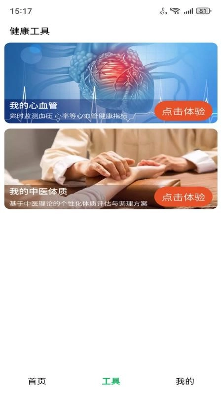 在工具板块,你可以轻松进行心血管和体质相关的体验,从而了解自己的身体状况。