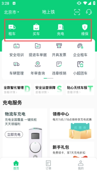 进入软件首页后,点击【租车】【买车】【充电】【维保】等功能按钮,即可获取对应的车辆服务。