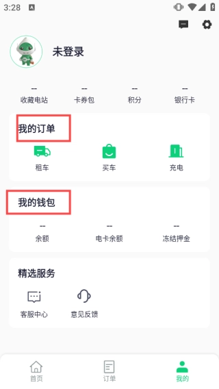 在【我的】页面中,点击【我的订单】能够查看租车、买车、充电等各类订单的详细信息;点击【我的钱包】则可以对余额、电卡余额等资金相关内容进行管理。
