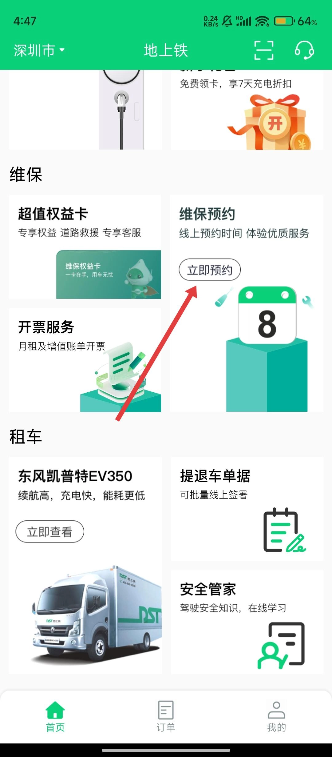 打开地上铁应用后,在首页找到【维保预约】板块里的【立即预约】按钮,点击该按钮就能进入预约界面啦。