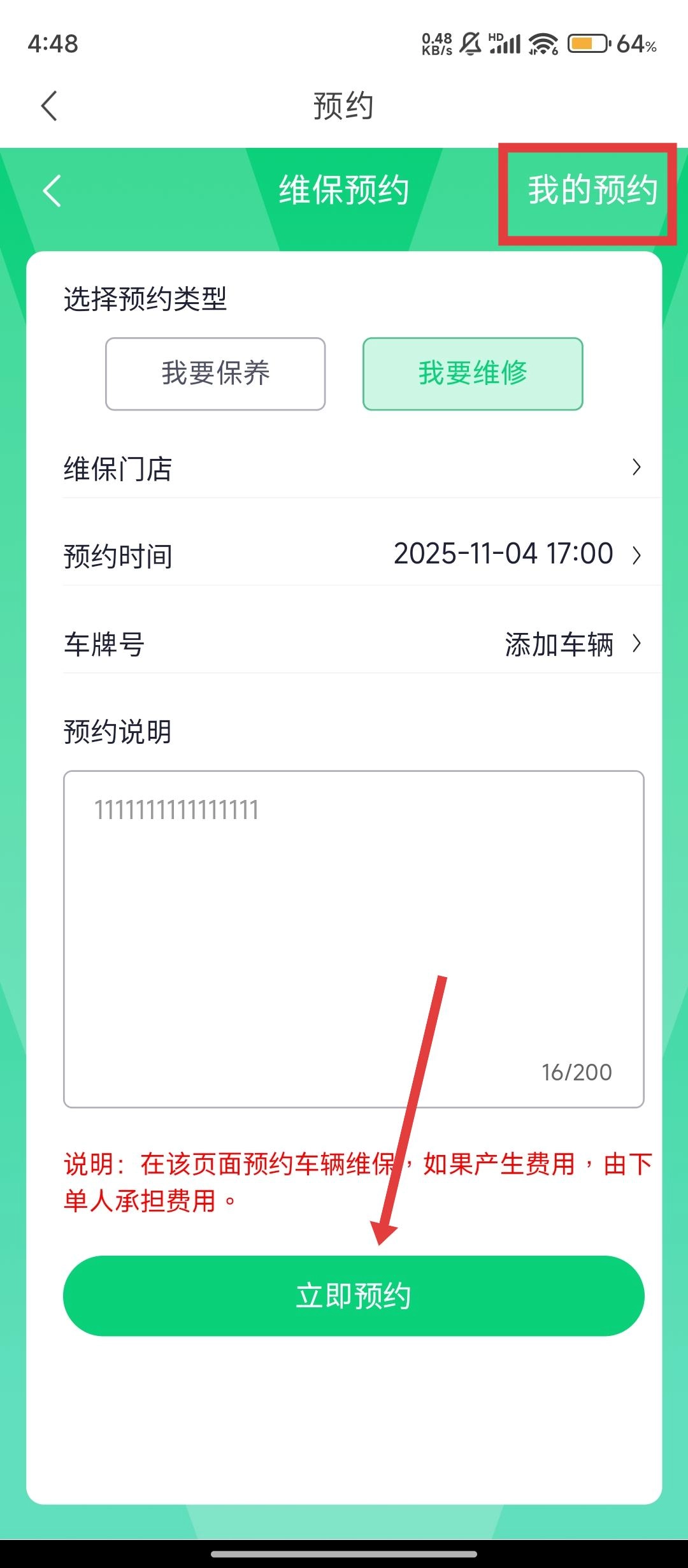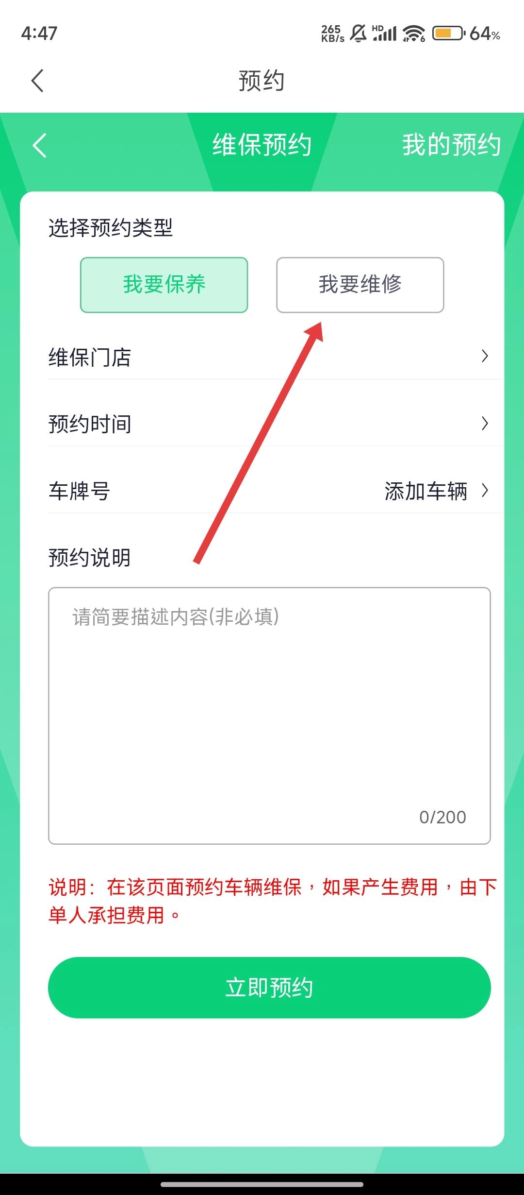在预约页面,先选择【我要维修】的类型,然后填写维保门店、预约时间之类的信息就可以啦。