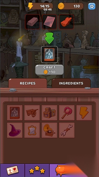 1、玩家在订单出现后,需要快速在炼金锅中合成客户所需的道具,每一项商品都由多个低阶物品融合生成,逐步升级品质。