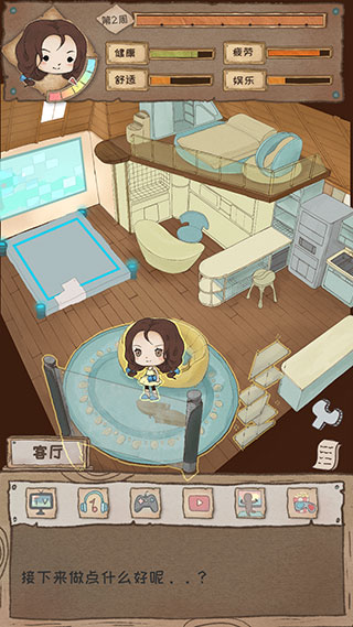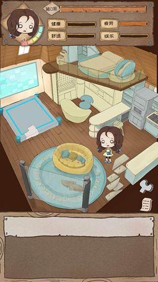 2、回到家中,我们便开启了辞职后的生活。此时却发现,主角的健康值、舒适值和娱乐值处于极低状态,而疲劳值竟达到了最高值。