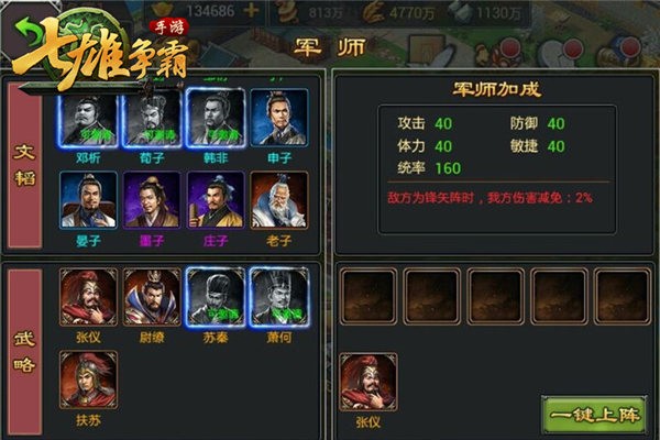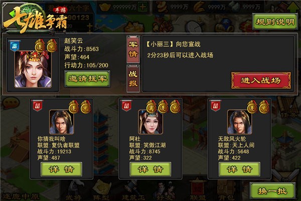 七雄争霸安卓版以战国时代为背景,融合同名网页游戏的精华,把战国策略的精彩画卷呈现于玩家掌心。这款游戏出色地还原了网页版的丰富精彩,以经典玩法为基础,细致展现任务系统、武将系统、城市建设、联盟体系等内容,还增添了神将系统、武将情侣、冒险等新奇元素,为玩家带来独特的游戏体验。玩家将扮演一方势力的君主,需要运筹帷幄,招募士兵,招揽众多名将,精心打造城池,全力发展势力,最终夺取中原霸主之位。