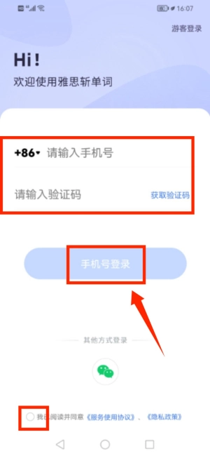 输入手机号及验证码并勾选协议完成登录。