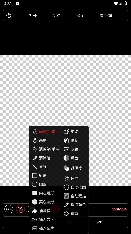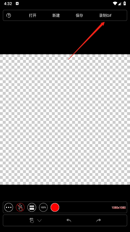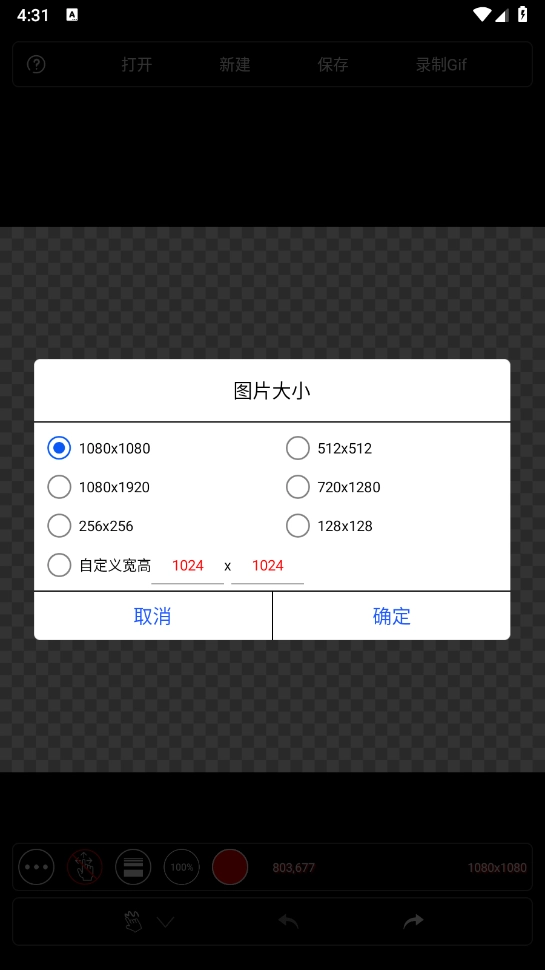 启动软件后,界面会呈现透明底色,此时可点击“创建”按钮,并对尺寸进行设置。
