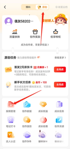 接着点击顶部的“原创”选项,进入原创发布页面后,再点击“投稿管理”按钮。