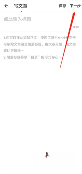 进入编辑界面后,即可着手编辑文章的正文部分。该页面的功能与网页版相近,十分强大。完成编辑后,点击“下一步”按钮即可。