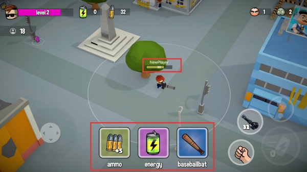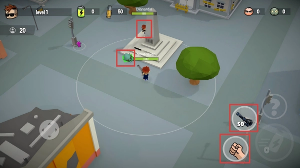 当遭遇僵尸或其他幸存者时,只要对方处于你的攻击范围内,就点击右侧的图标发起攻击。近处的敌人可以用【拳头】对付,远处的则切换枪械射击,把敌人消灭掉。